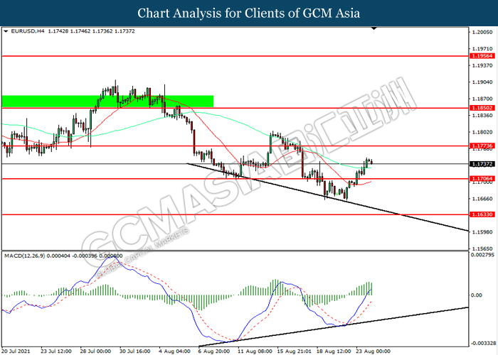 EURUSD, H4: EURUSD was traded higher following prior breakout above the previous resistance level at 1.1705. MACD which illustrated increasing bullish momentum suggest the pair to extend its gains toward resistance level at 1.1775.