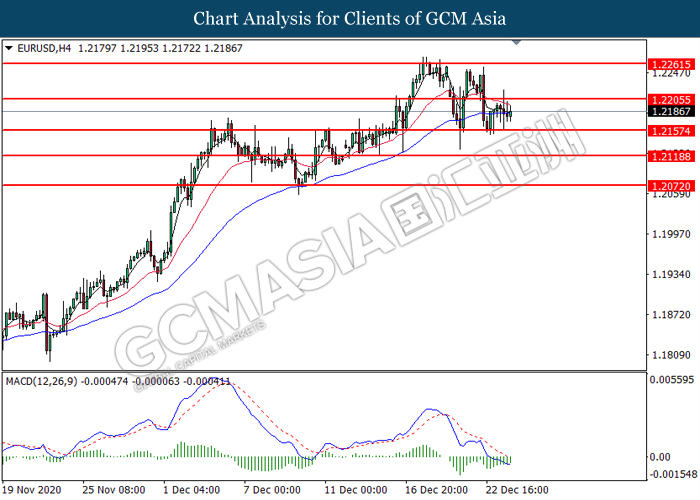 EURUSD, H4: EURUSD was traded lower following prior retracement from the resistance level at 1.2205. MACD which illustrated bearish bias momentum suggest the pair to extend its losses toward the support level at 1.2155.