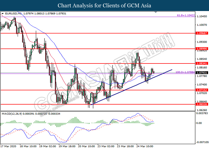 EURUSD, H1: EURUSD was traded higher following prior rebound from the upward trendline. MACD which illustrate diminishing bearish momentum suggests the pair to extend its gains toward the resistance level at 1.0835.