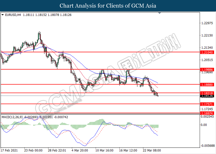EURUSD, H4: EURUSD was traded lower following prior breakout below the previous support level at 1.1830. MACD which illustrated bearish bias momentum signal suggest the pair to extend its losses toward the support level at 1.1755.