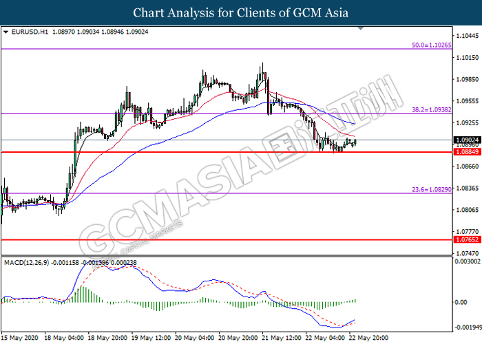 EURUSD, H1: EURUSD was traded higher following prior rebound from the support level at 1.0885. MACD which illustrate bullish momentum signal suggest the pair to extend its gains toward the resistance level at 1.0940.