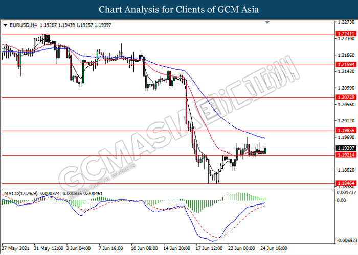EURUSD, H4: EURUSD was traded higher following prior rebound from the support level 1.1920. MACD which illustrate ongoing bullish momentum signal suggest the pair to extend its gains towards the resistance level 1.1985.