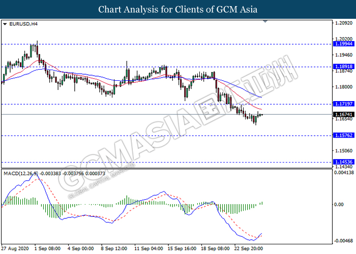 EURUSD, H4: EURUSD was traded higher following prior rebound from its low level. MACD which illustrate bullish momentum signal with the formation of golden cross suggest the pair to extend its rebound towards the resistance level 1.1720.