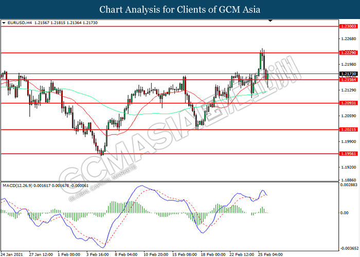 EURUSD, H4: EURUSD was traded lower while currently testing the support level at 1.2155. However, MACD which illustrated diminishing bullish momentum suggest the pair to extend its losses after it successfully breakout below the support level.