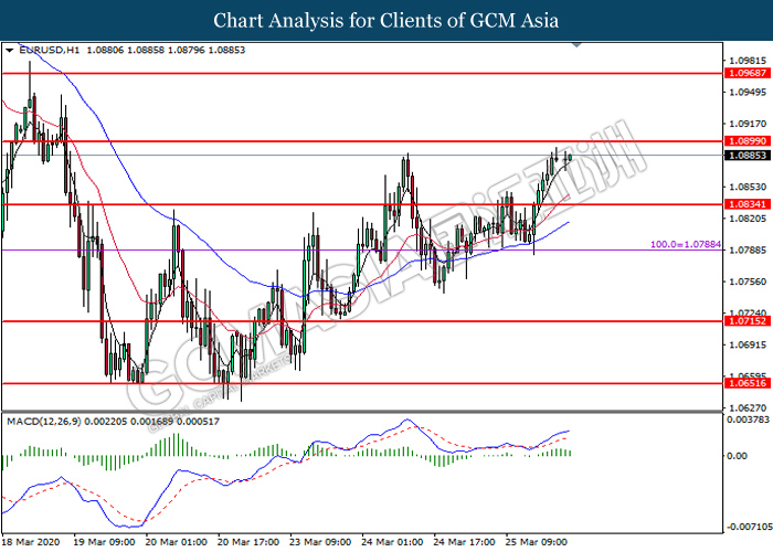 EURUSD, H1: EURUSD was traded higher following prior breakout above the previous resistance level at 1.0835. However, MACD which illustrate diminishing bullish momentum suggests the pair to undergo technical correction toward the support level at 1.0835.