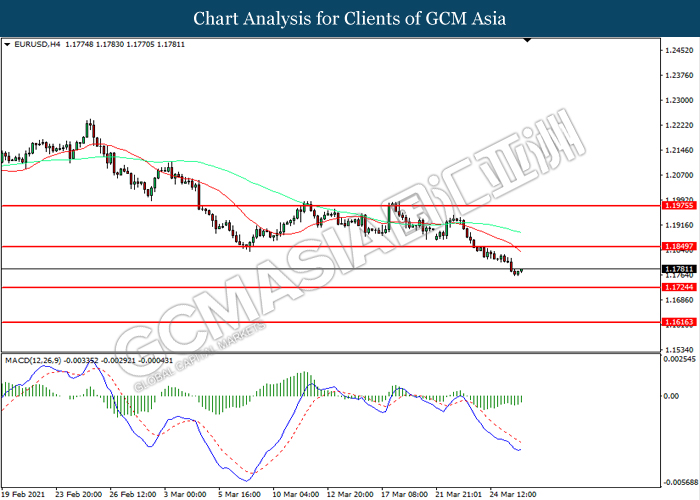 EURUSD, H4: EURUSD was traded lower following prior breakout below the previous support level at 1.1850. However, MACD which illustrated diminishing bearish momentum suggest the pair to be traded higher in short-term as technical correction.
