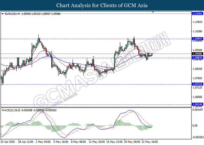 EURUSD, H4: EURUSD was traded higher following prior rebound from the support level 1.0885. MACD which illustrate diminishing bearish momentum suggest the pair to extend its rebound towards the resistance level 1.0995.