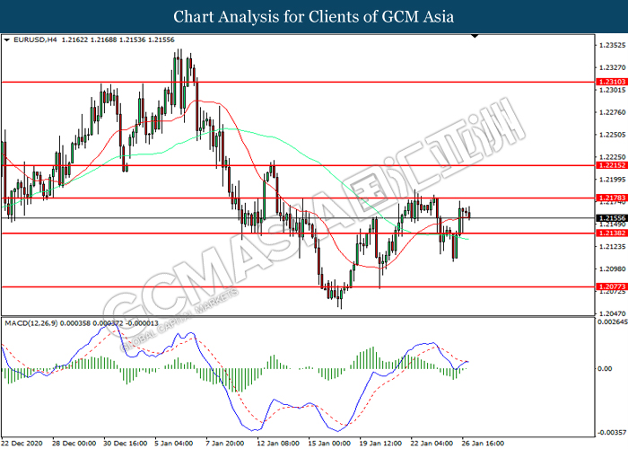 EURUSD, H4: EURUSD was traded higher while currently testing the resistance level at 1.2180. MACD which illustrated diminishing bearish momentum suggest the pair to extend its gains after it successfully breakout above the resistance level.