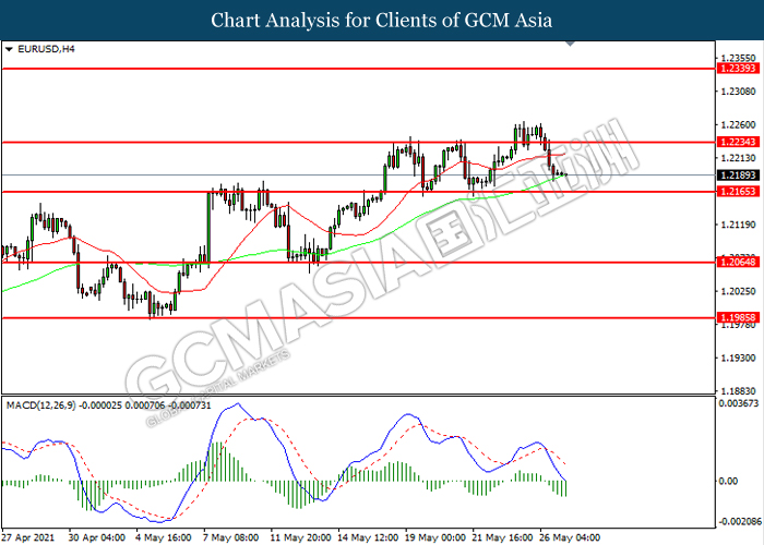 EURUSD, H4: EURUSD was traded lower following prior retracement from the resistance level at 1.2235. MACD which illustrated increasing bearish momentum suggest the pair to extend its losses toward support level at 1.2165.