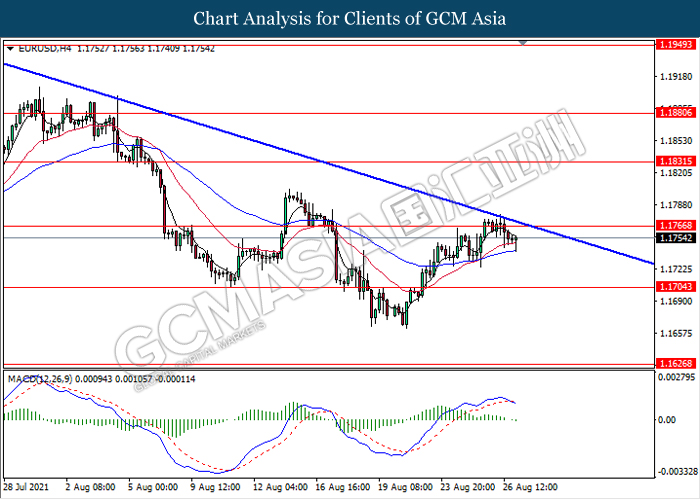 EURUSD, H4: EURUSD was traded lower following prior retracement from the resistance level 1.1765. MACD which illustrate bearish momentum signal with the formation of death cross suggest the pair to extend its retracement towards the support level 1.1705.