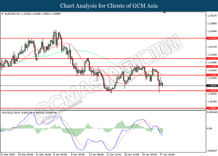 EURUSD, H4: EURUSD was traded lower while currently near the support level at 1.2065. MACD which illustrated increasing bearish momentum suggest the pair to extend its losses after it successfully breakout below the support level at 1.2065.