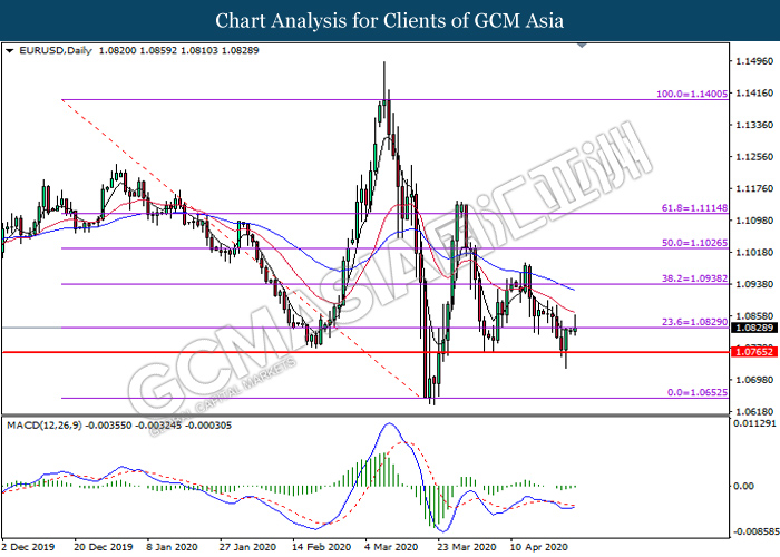 EURUSD, Daily: EURUSD was traded higher while currently testing the resistance level at 1.0830. MACD which illustrate diminishing bearish momentum suggest the pair to extend its gains after it successfully breakout above the resistance level.