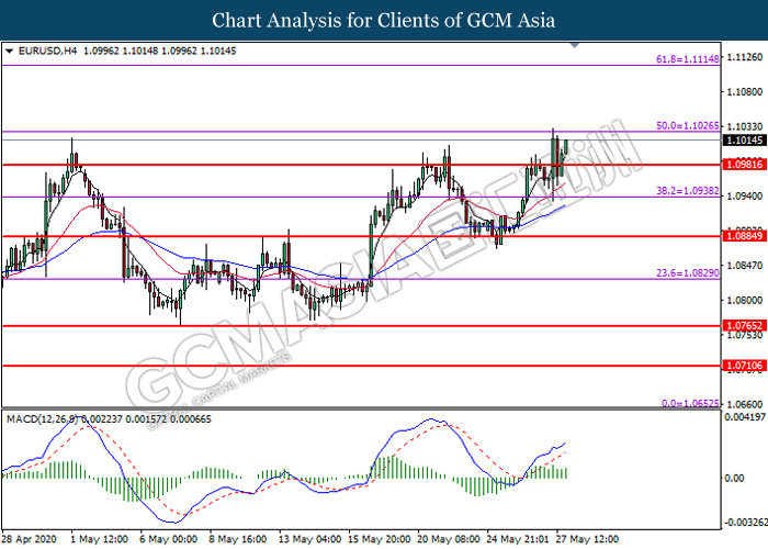 EURUSD, H4: EURUSD was traded higher while currently testing the resistance level at 1.1025. MACD which illustrate bullish bias momentum signal suggest the pair to extend its gains after it successfully breakout above the resistance level at 1.1025.