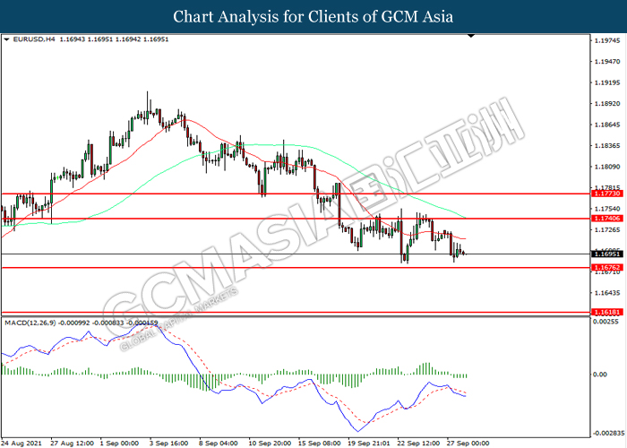EURUSD, H4: EURUSD was traded lower while currently testing the support level at 1.1675. However, MACD which illustrated diminishing bearish momentum suggest the index to be traded higher in short-term as technical correction.