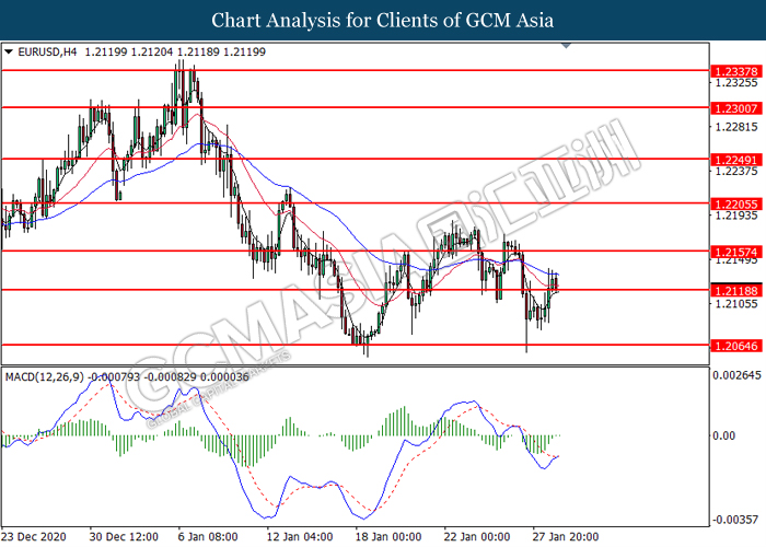EURUSD, H4: EURUSD was traded higher following prior breakout above the previous resistance level at 1.2120. MACD which illustrated diminishing bearish momentum suggest the pair to extend its gains toward the resistance level at 1.2155.