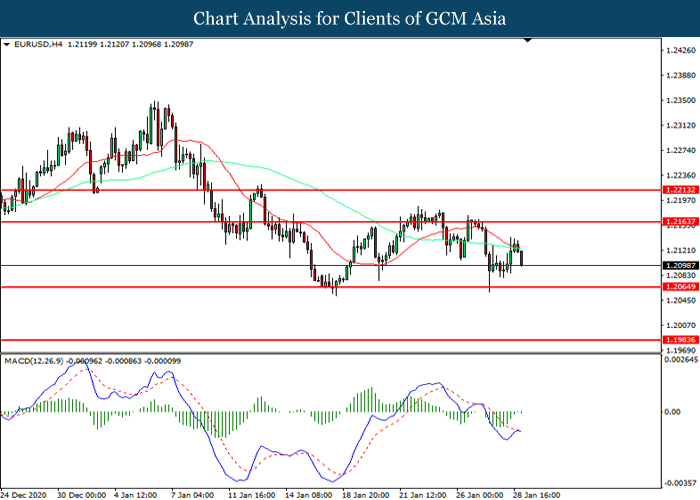 EURUSD, H4: EURUSD was traded lower while currently near the support level at 1.2065. MACD which illustrated increasing bearish momentum suggest the pair to extend its losses after it successfully breakout below the support level.