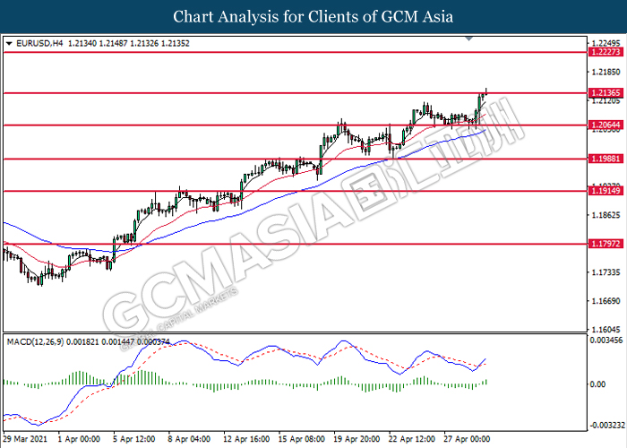 EURUSD, H4: EURUSD was traded higher while currently testing the resistance level at 1.2135. MACD which illustrated bullish bias momentum signal suggest the pair to extend its gains after it successfully breakout above the resistance level at 1.2135.
