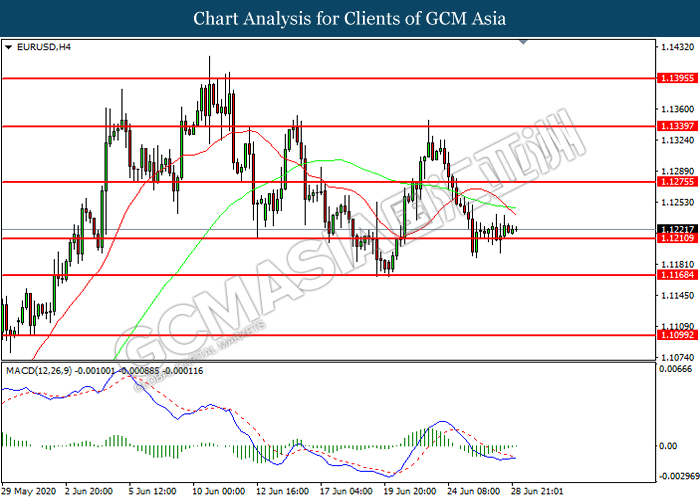 EURUSD, H4: EURUSD was traded within a range while currently testing the support level at 1.1210. MACD which illustrated diminishing bearish momentum suggest the pair to be traded higher in short-term as technical correction.