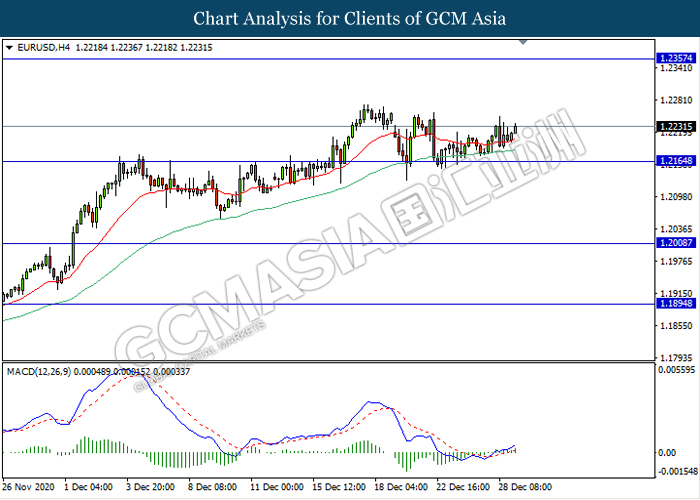 EURUSD, H4: EURUSD was traded higher following recent rebound from the support level 1.2165. MACD which illustrate bullish momentum signal with the recent formation of golden cross suggest the pair to extend its rebound towards the resistance level 1.2355.