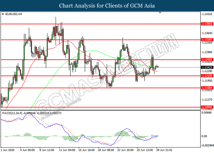 EURUSD, H4: EURUSD was traded lower following prior retracement from the resistance level at 1.1270. MACD which illustrated diminishing bullish momentum suggest the pair to extend its losses toward support level at 1.1210.
