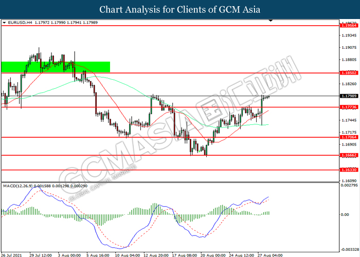 EURUSD, H4: EURUSD was traded higher following prior breakout above the previous resistance level at 1.1775. MACD which illustrated increasing bullish momentum suggest the pair to extend its gains toward resistance level at 1.1850.