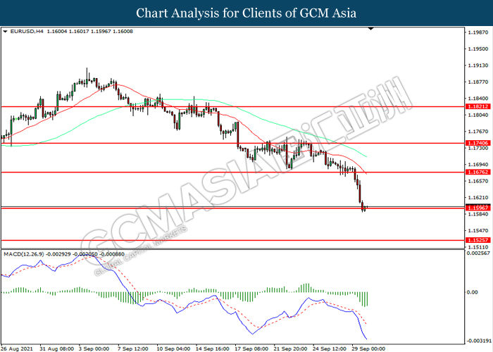 EURUSD, H4: EURUSD was traded lower while currently testing the support level at 1.1600. However, MACD which illustrated diminishing bearish momentum suggest the pair to be traded higher in short-term as technical correction.