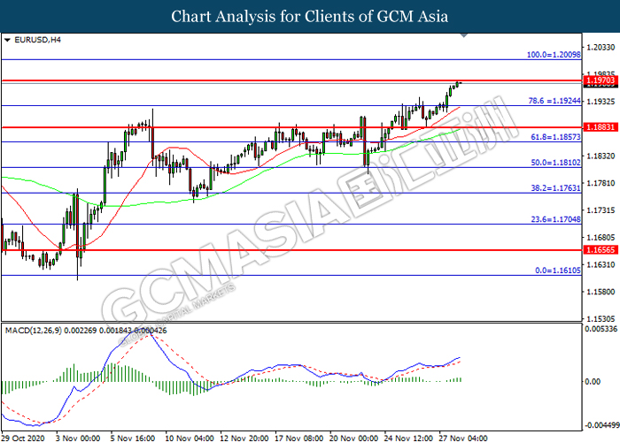 EURUSD, H4: EURUSD was traded higher while currently testing the resistance level at 1.1970. MACD which illustrated increasing bullish momentum suggest the pair to extend its gains after it successfully breakout above the resistance level.