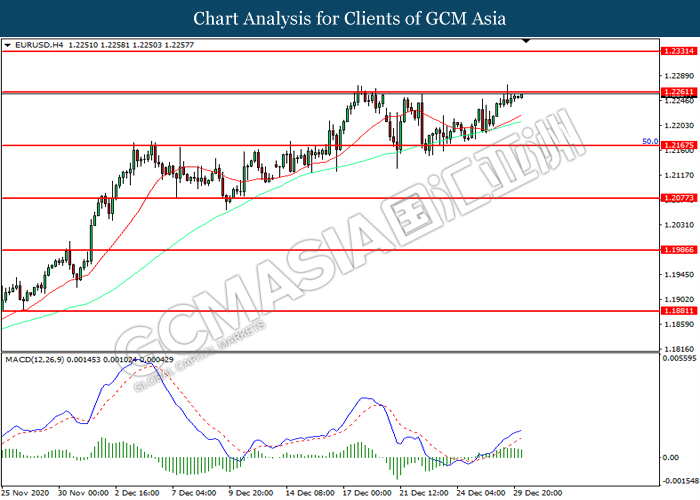EURUSD, H4: EURUSD was traded higher while currently testing the resistance level at 1.2260. However, MACD which illustrated diminishing bullish momentum suggest the pair to be traded lower in short-term as technical correction.