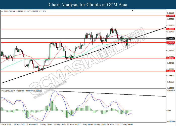 EURUSD, H4: EURUSD was traded higher following prior rebound from the support level at 1.2170. MACD which illustrated diminishing bearish momentum suggest the pair to extend its gains toward resistance level at 1.2255.