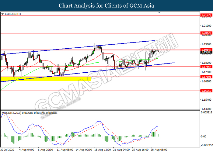 EURUSD, H4: EURUSD was traded higher while currently testing the resistance level at 1.1915. However, MACD which illustrated diminishing bullish momentum suggest the pair to be traded lower in short-term as technical correction.