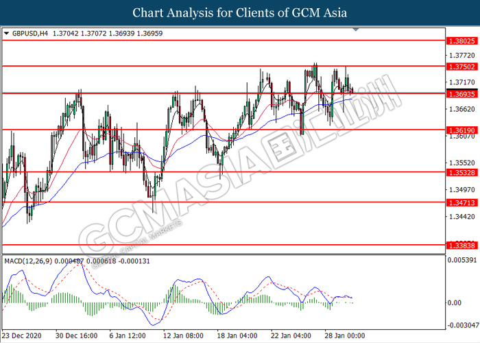 GBPUSD, H4: GBPUSD was traded lower while currently testing the support level at 1.3695. MACD which illustrated diminishing bullish momentum suggest the pair to extend its losses after it successfully breakout below the support level at 1.3695.
