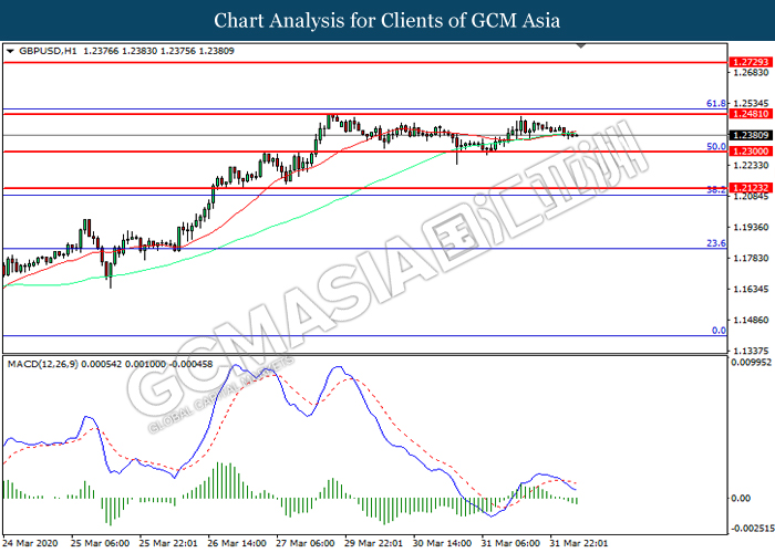 GBPUSD, H1: GBPUSD was traded lower following prior retracement from the resistance level at 1.2480. MACD which illustrated increasing bearish momentum suggest the pair to extend its losses toward support level at 1.2300.