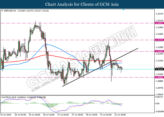GBPUSD, H1: GBPUSD was traded lower following recent breakout below the trend line. MACD which illustrate ongoing bearish momentum suggest the pair may extend its losses towards the support level 1.3095
