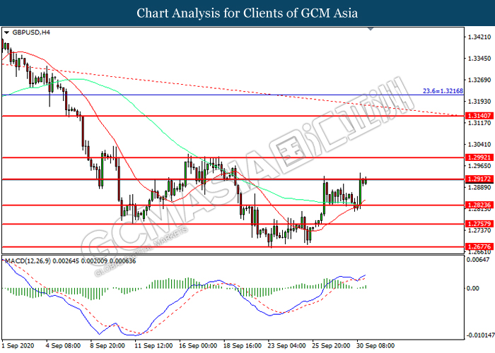 GBPUSD, H4: GBPUSD was traded higher while currently testing the resistance level at 1.2915. MACD which illustrated increasing bullish momentum suggest the pair to extend its gains after it successfully breakout above the resistance level.
