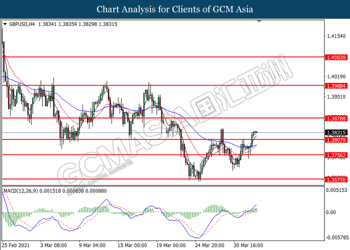 GBPUSD, H4: GBPUSD was traded higher following prior breakout above the previous resistance level at 1.3805. MACD which illustrated bullish bias momentum suggest the pair to extend its gains toward the resistance level at 1.3880.