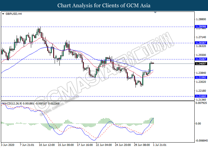 GBPUSD, H4: GBPUSD was traded higher while currently testing the resistance level 1.2510. MACD which illustrate ongoing bullish momentum suggest the pair to extend its gains after it breaks above the resistance level 1.2510.