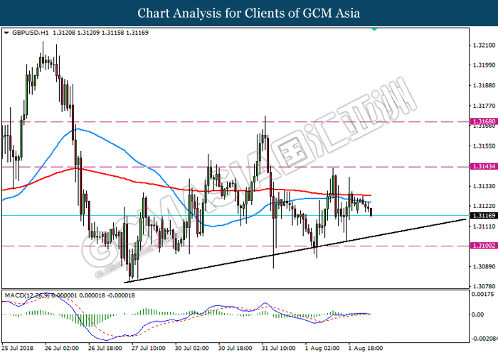GBPUSD, H1: GBPUSD was traded higher while currently consolidate below the MA lines. Due to the lack of signal from MACD and price action, it is suggested to wait until further clear signal appear such as breakout below the trend line of rebound from the trend line.