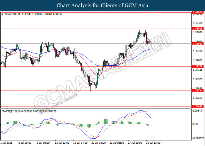 GBPUSD, H4: GBPUSD was traded lower while currently testing the support level 1.3890. MACD which illustrate bearish momentum signal with the recent formation of death cross suggest the pair to extend its losses after it breaks below the support level.