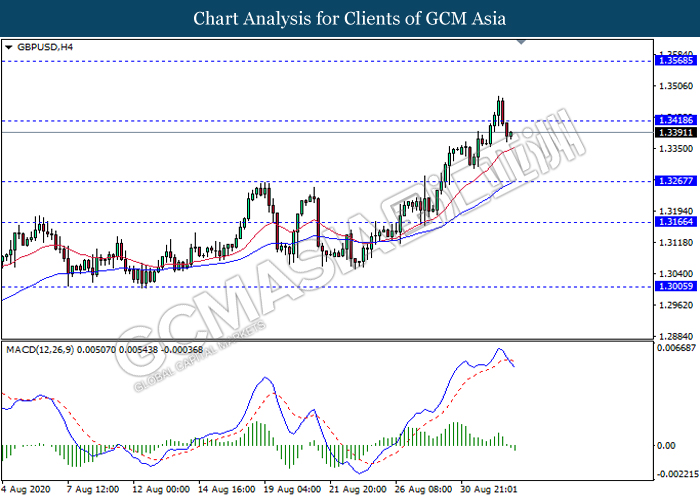 GBPUSD, H4: GBPUSD was traded higher while currently testing near the resistance level 1.3420. However, MACD which display bearish momentum signal with the formation of death cross suggested the pair to experience a technical correction towards the support level 1.3265.