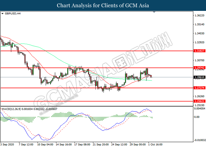 GBPUSD, H4: GBPUSD was traded lower following prior retracement from the resistance level at 1.2975. MACD which illustrated increasing bearish momentum suggest the pair to extend its losses toward support level at 1.2725.