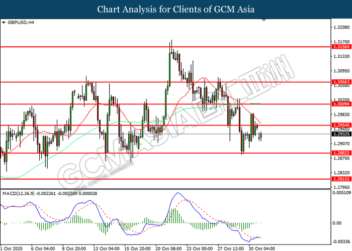 GBPUSD, H4: GBPUSD was traded lower following prior breakout below the previous support level at 1.2955. However, MACD which illustrated diminishing bearish momentum suggest the pair to be traded higher in short-term as technical correction.