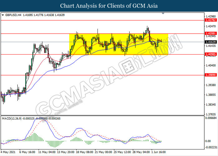 GBPUSD, H4: GBPUSD remain traded in a sideway channel. However, MACD which illustrate bearish momentum signal suggest the pair to be traded lower towards the support level 1.4100.