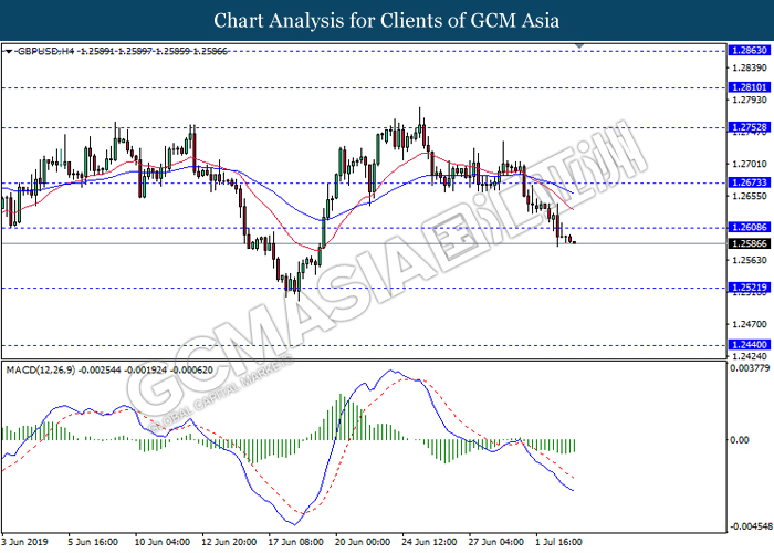 GBPUSD, H4: GBPUSD was traded lower following prior breakout below previous support level 1.2610. However, MACD which illustrate diminishing bearish momentum suggest the pair to experience a short-term technical correction towards the resistance level 1.2610.