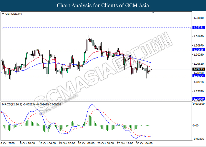 GBPUSD, H4: GBPUSD was traded higher following prior rebound from the support level 1.2870. MACD which illustrate bullish bias signal with the starting formation of golden cross suggest the pair to extend its rebound towards the resistance level 1.3060.