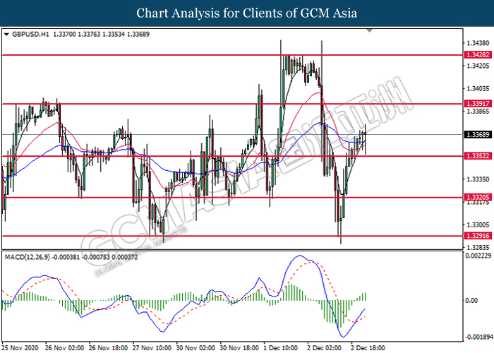 GBPUSD, H1: GBPUSD was traded higher following prior rebound from the support level at 1.3350. MACD which illustrates increasing bullish momentum suggest the pair to extend its rebound toward the resistance level at 1.3390.