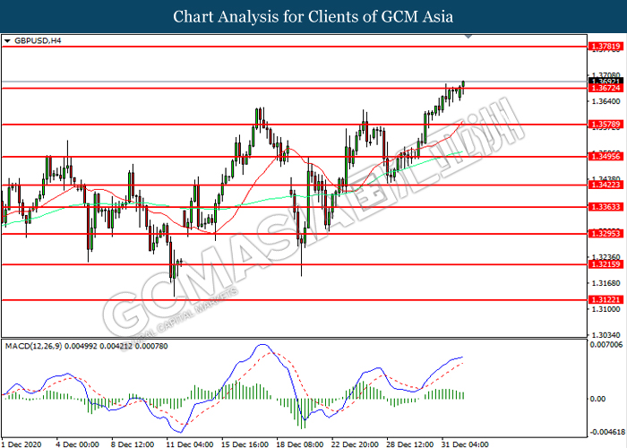 GBPUSD, H4: GBPUSD was traded higher while currently testing the resistance level at 1.3675. However, MACD which illustrated diminishing bullish momentum suggest the pair to be traded lower in short-term as technical correction.