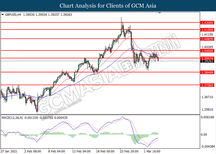 GBPUSD, H4: GBPUSD was traded lower while currently testing the support level at 1.3945. MACD which illustrated diminishing bullish momentum suggest the pair to extend its losses after its candle closed below the support level at 1.3945.