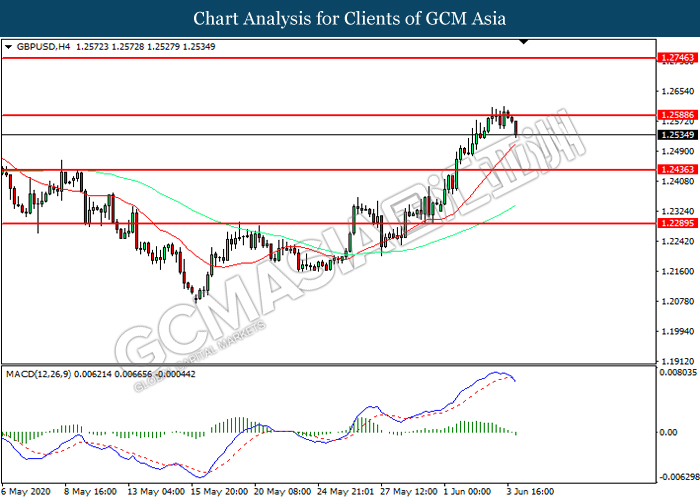 GBPUSD, H4: GBPUSD was traded lower following prior retracement from the resistance level at 1.2590. MACD which illustrated increasing bearish momentum suggest the pair to extend its losses toward support level at 1.2435.