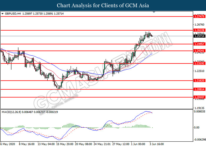 GBPUSD, H4: GBPUSD was traded lower following prior retracement from the resistance level at 1.2625. MACD which illustrate diminishing bullish momentum suggest the pair to extend its losses toward the support level at 1.2495.