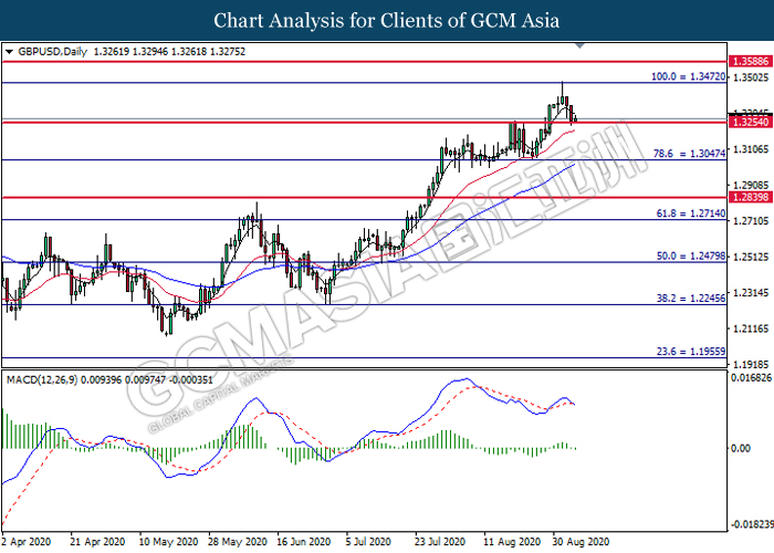 GBPUSD, Daily: GBPUSD was traded lower while currently testing the support level at 1.3255. MACD which illustrated diminishing bullish momentum suggest the pair to extend its losses after it successfully breakout below the support level at 1.3255.